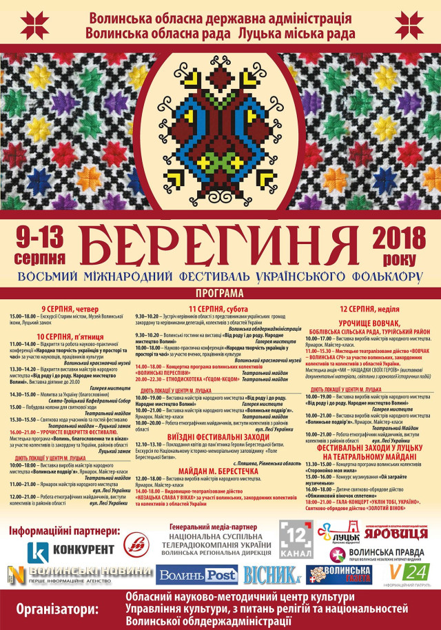 Оргкомітет Восьмого Міжнародного фестивалю українського фольклору «Берегиня» інформує, що у зв’язку з оголошеним у м. Луцьку Днем жалоби та проведенням панахиди за загиблим на Сході України бійцем вносяться зміни до програми фестивалю «Берегиня». Зокрема, 11 серпня, в суботу, відмінені концертні програми та етнодискотека у центрі міста Луцька (з 14.00 до 22.00 ). На Театральному майдані та вул. Лесі Українки міста Луцька діятимуть Містечко майстрів, етнокуточки, проводитимуться майстер-класи, виставки в Галереї мистецтв.