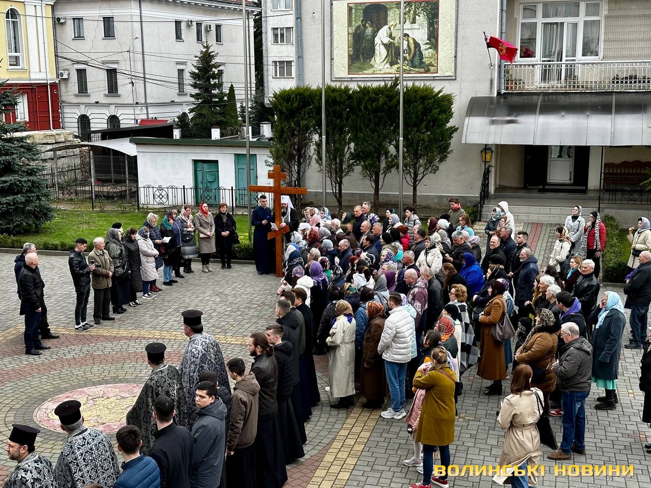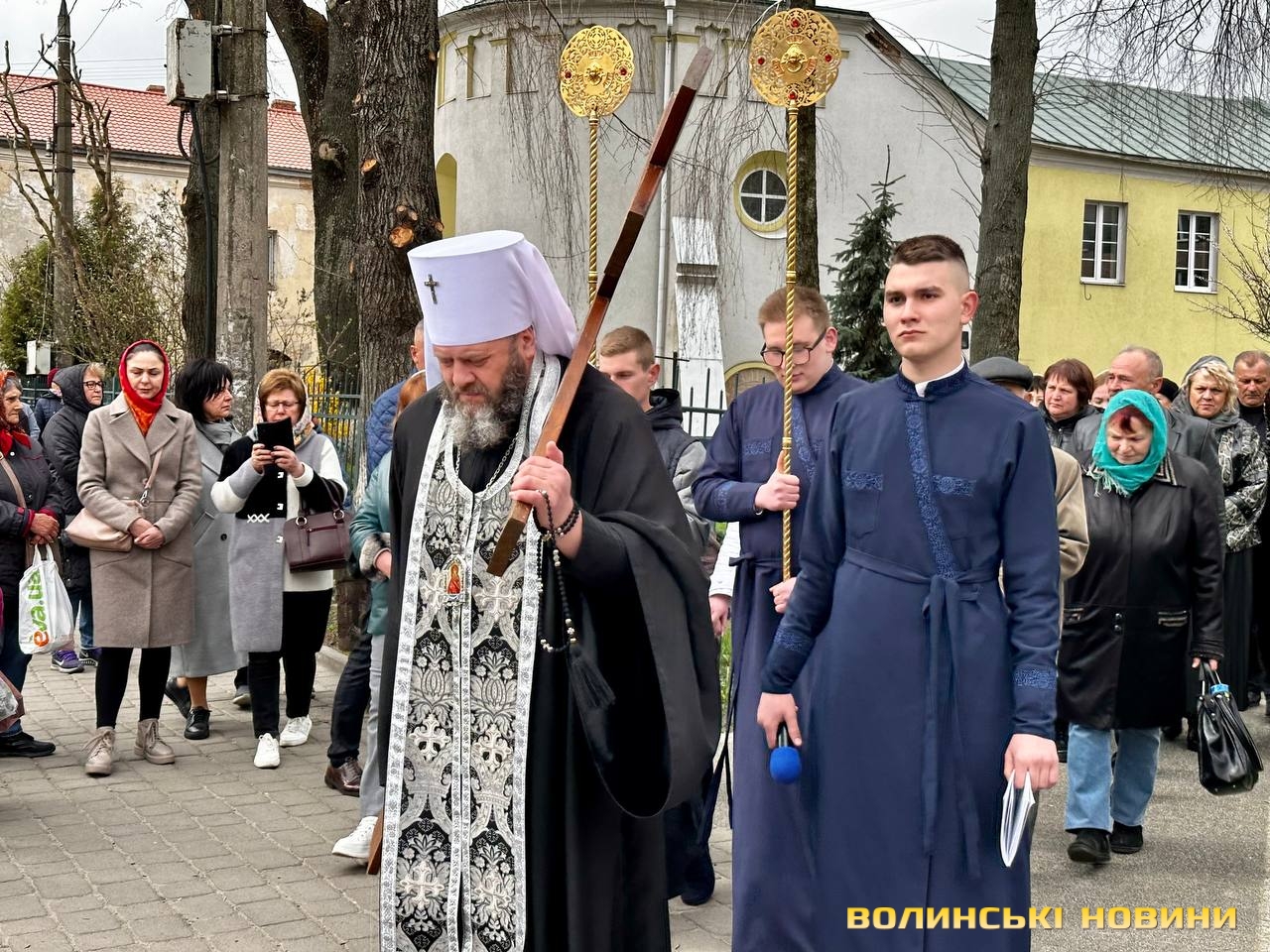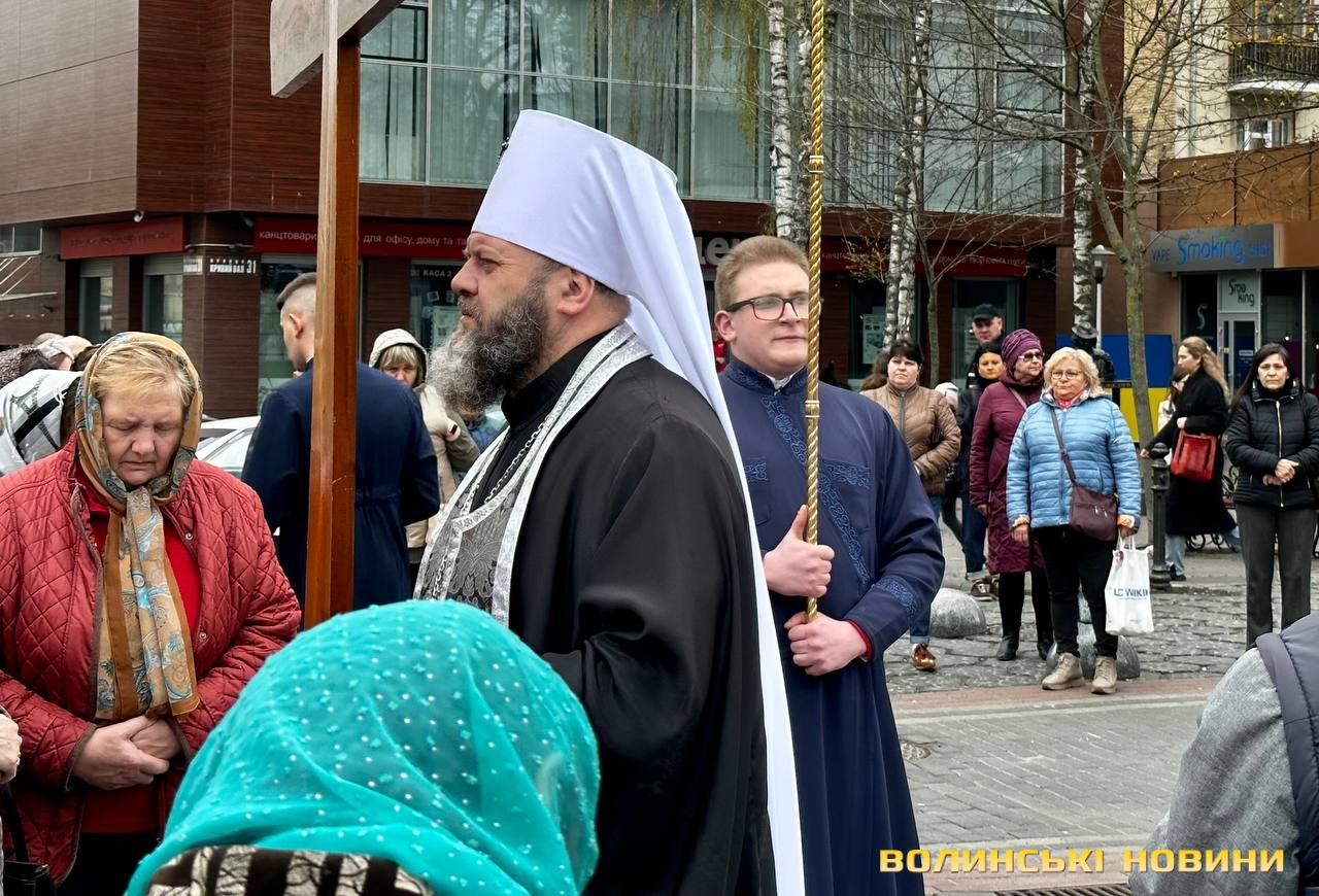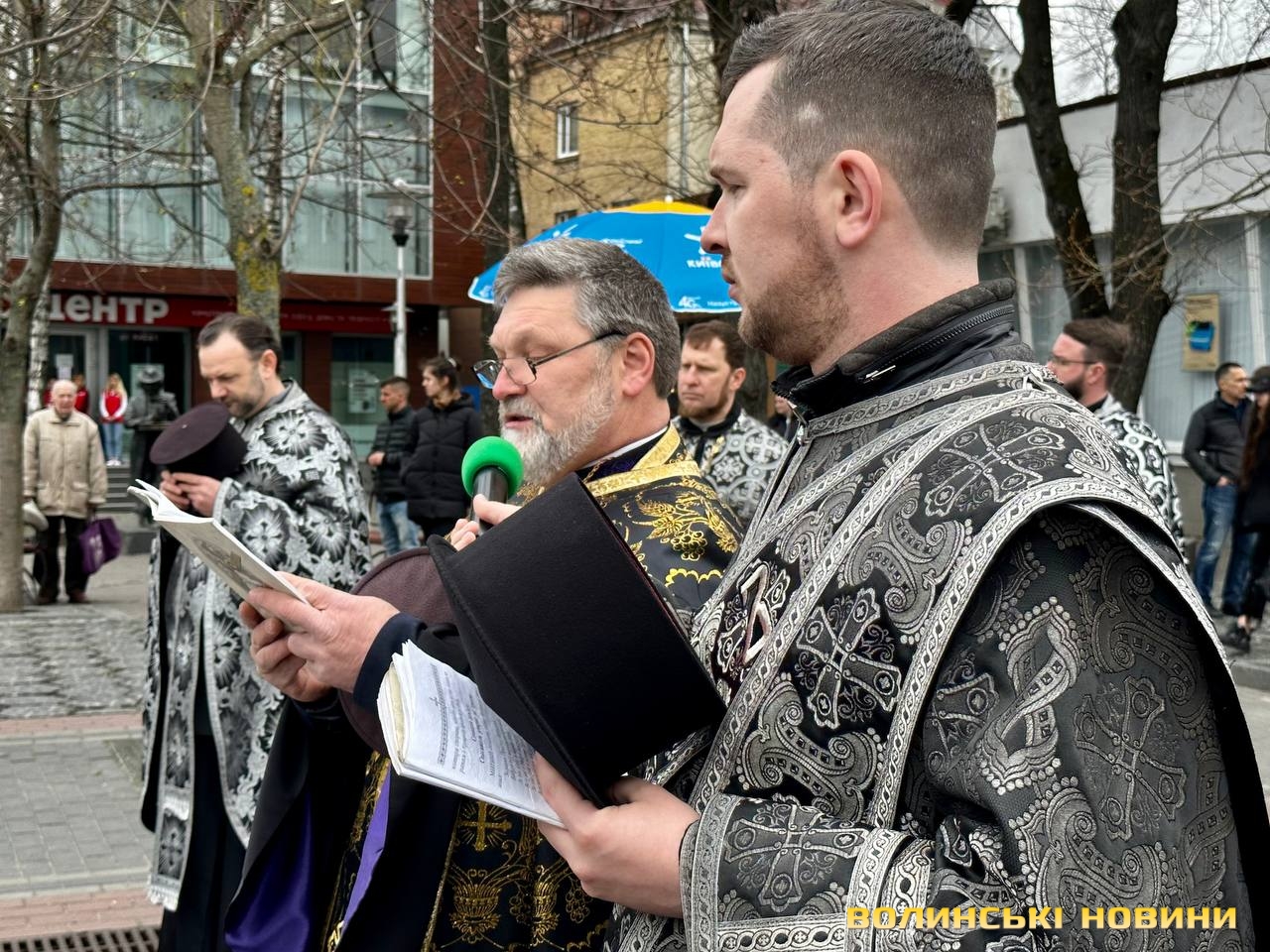 Хресний хід, який зараз ми практикуємо в Луцьку, – це переосмислення найкращих традицій Православної церкви і традицій, які зародилися на Заході. Тобто це і православний Хресний хід, і православні молитви, і хід із 12 зупинками. Це особливе богослужіння. Відбуваються зупинки для того, щоб прочитати певний уривок, присвячений Страстям. До цього уривку підібрано молитви з проханнями, за що ми молимося: за воїнів, за недужих, за тих, хто в полоні, за Батьківщину, за біженців. Ми промовляємо ці молитви, щоби жертва Христа-Спасителя, який віддав своє життя заради усіх нас, зокрема, поширювалася на ті прохання, які є актуальними для нас зараз», – пояснив отець Віталій.Опісля Хресної ходи на території Свято-Троїцького собору звершили чин винесення плащаниці.