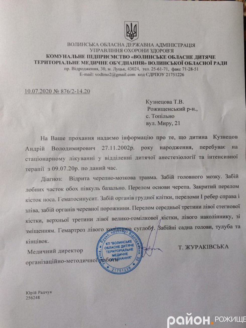 Постраждалий хлопець – житель села Топільне Рожищенського району. Внаслідок аварії він отримав низку важких травм і перебуває у відділенні дитячої анестезіології та інтенсивної терапії дитячої обласної лікарні в Луцьку. Стан хлопця важкий.