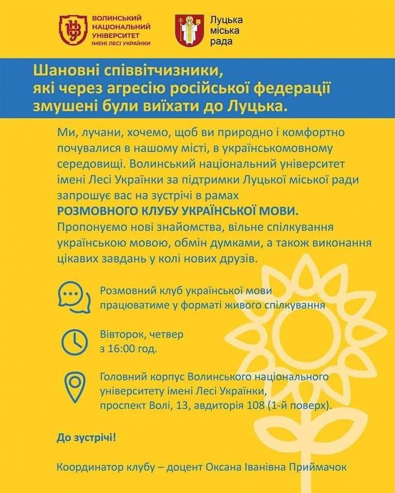 «Заняття у клубі проходитимуть двічі на тиждень: у вівторок та четвер. Ми очікуємо, що їх можуть відвідувати навіть різні люди. Тобто наш клуб не передбачає якоїсь чіткої програми, коли, наприклад, якщо ви не були на попередньому занятті, то вже не маєте що робити на наступному. Це не уроки чи академічні заняття, а робота за кількома напрямками. В нас є рубрика «Український мовний етикет», де ми згадуємо елементарні формули на випадок загальних ситуацій. Ми промовляємо скоромовки, робимо фонетичні вправи, розробляємо мовленнєвий апарат. Зараз ми підбираємо цікаві тексти для читання, наприклад, про історію Волині», – зауважила Оксана Приймачок.На заняття, які відбуваються о 16:00 в аудиторії № 108 головного корпусу ВНУ імені Лесі Українки, можуть приходити всі охочі. Організатори не виключають, що розмовний клуб продовжить своє існування і після перемоги України.
