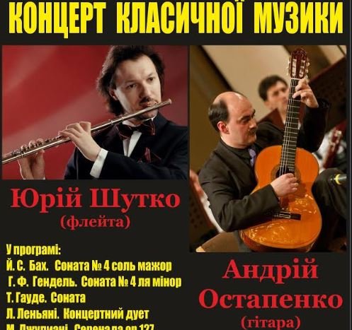 Луцьких меломанів запрошують на концерт класичної музики. Цього разу – за участю визначних вітчизняних музикантів, солістів Національної філармонії України, заслужених артистів України Юрія Шутка (флейта) і Андрія Остапенка (гітара).