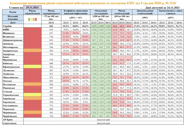 У жодному регіоні станом на 24 листопада не перевищено показник завантаженості ліжок з киснем, відведених для лікування хворих на COVID-19. Загалом по країні цей показник становить 51,7% при визначеному граничному рівні 65%. В столиці показник завантаженості ліжок з киснем становить 58,9%.