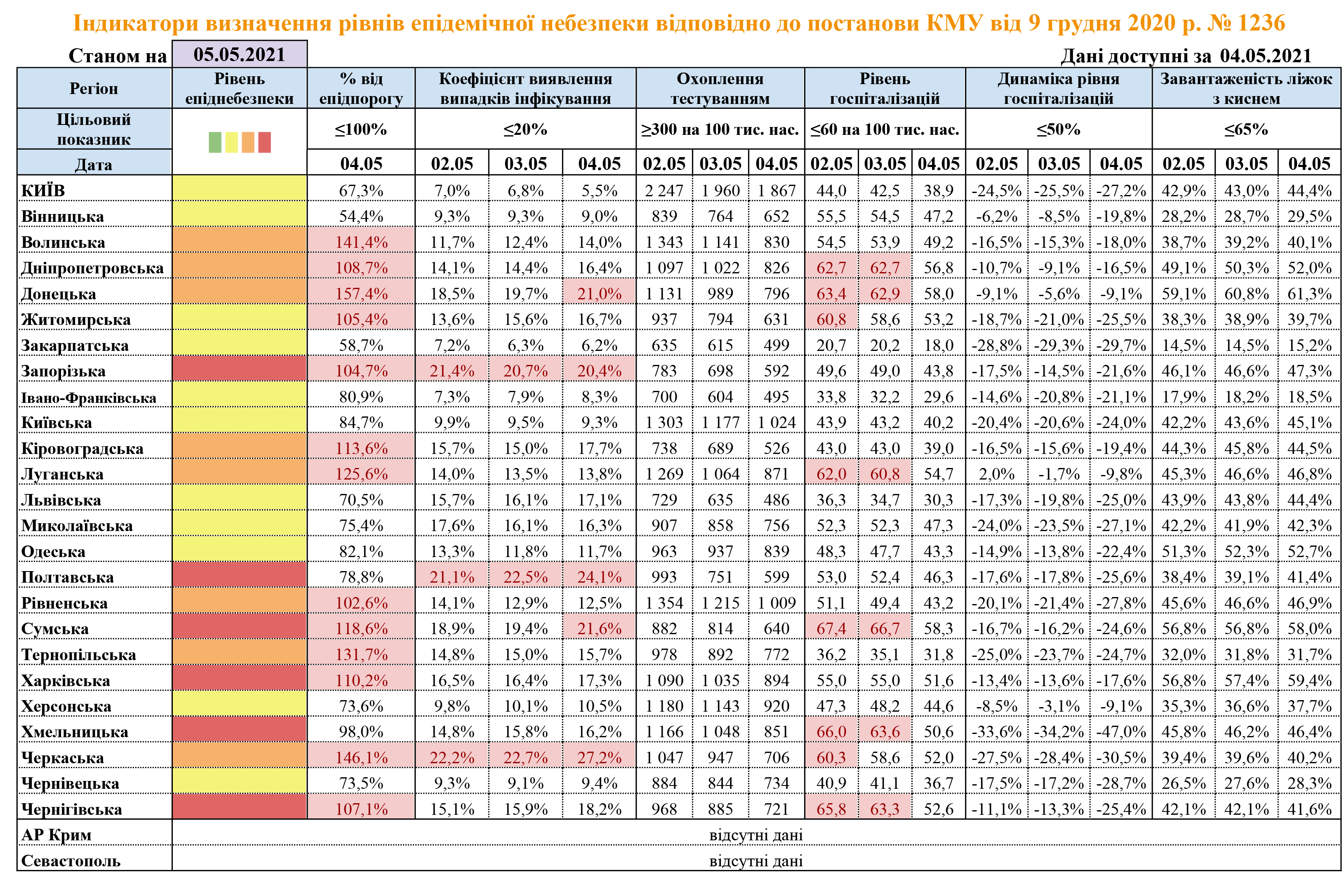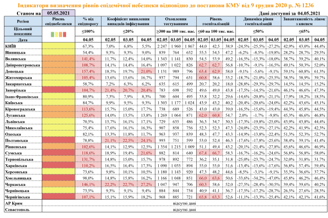 Станом на 5 травня у «червоній» зоні епідемічної небезпеки перебувають 6 регіонів. Перевищення рівня госпіталізацій хворих на коронавірусну інфекцію не зафіксовано в жодній з областей.