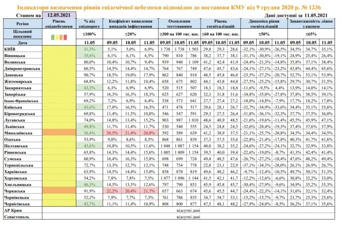 Миколаївська та Черкаська області залишаються у «помаранчевій» зоні, оскільки протягом останніх трьох днів там перевищений коефіцієнт виявлення випадків інфікування коронавірусом.Нагадаємо, в Україні за добу 11 травня виявили 4 538 нових випадків коронавірусної хвороби COVID-19, госпіталізували 1 349 осіб, померли 356 хворих, одужали 19 766 осіб.