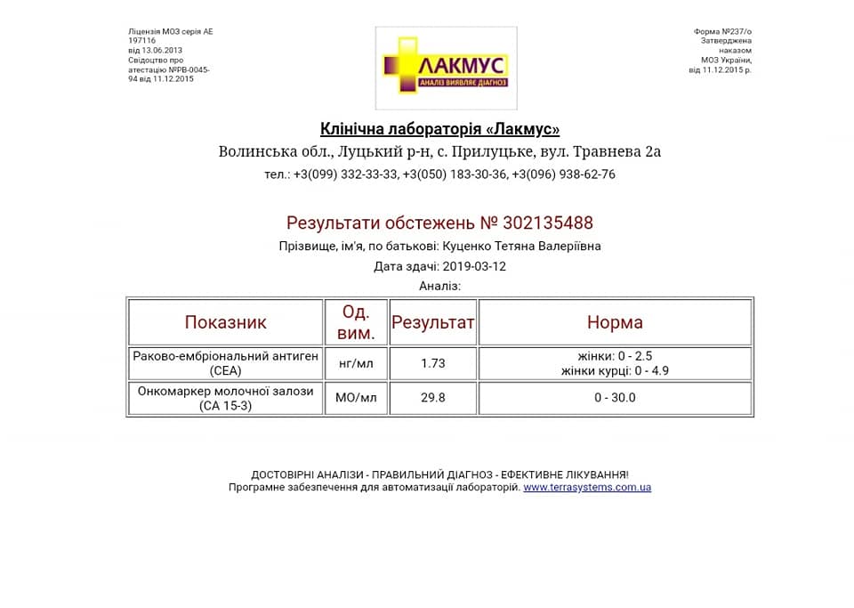 «Напишу коротко – 6 курс починаю . Аналізи допустимі до курсу. Хоча лейкоцити низькуваті, мають бути не менше 2 ,а в мене 2.2 , це все дія Ібрансу, зате гемоглобін високий – це добре, онкомаркери взагалі впали. Так що це для мене приємно, можливо він нарешті здався? Це я про рак...Наступне КТ буде 20 травня , яке покаже , молю Бога – повний регрес метастаз і оптимістичний прогноз продовження років мого життя! Але ,на жаль, це не буде означати ,що він не зможе мене знову пробувати атакувати. Тому мені прийдеться приймати ці курси так поки як по клінічним дослідженням 30 місяців. Якщо щось піде не так на КТ і покаже ріст пухлини, то я поїду одразу на операцію – абляцію печінки, так як пухлина залишилася одна, це можна буде мені зробити. А так я повертаюся потрохи до звичайного нормального життя, і навіть можу швидко йти-бігати і навіть не хочеться згадувати «те пережите». Дякую Вам за те, що живу, за те, що продовжуєте мені життя! Благодійні фонди дорослим не допомагають! Закупки » Ібрансу" державою не буде!Без Вас я ніяк! Все завдяки Вам! Бережи Вас Бог», – пише волинянка.