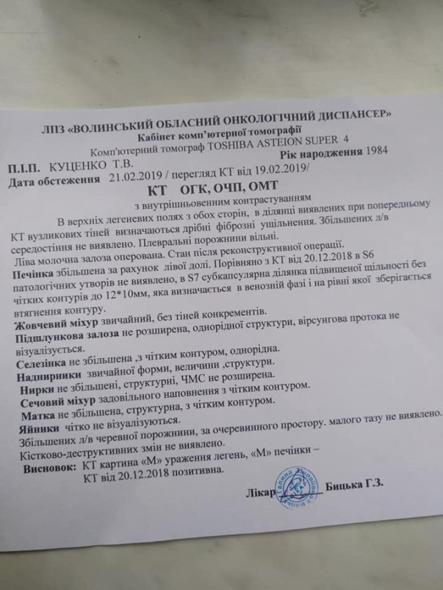 Онкохвора волинянка Тетяна Куценко розповіла про результати лікування за сім місяців: метастази зникли, а з 5 пухлин залишилась тільки одна. Проте ще не час здаватись, «потрібно йти до кінця».