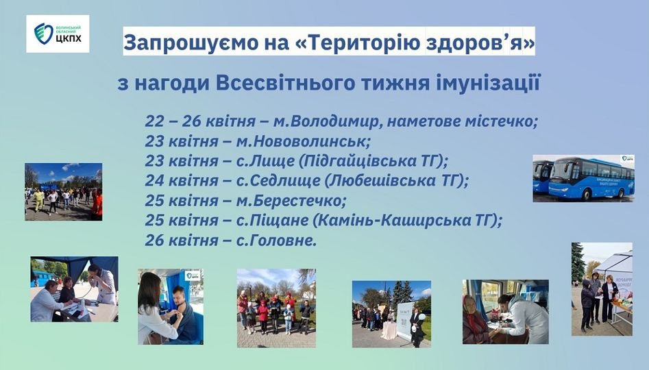 За ініціативи ВООЗ в останній тиждень квітня в усіх країнах світу відзначають Всесвітній тиждень імунізації. Тож Волинський обласний центр контролю та профілактики хвороб організовує низку просвітницьких заходів, які відбудуться в різних населених пунктах краю.