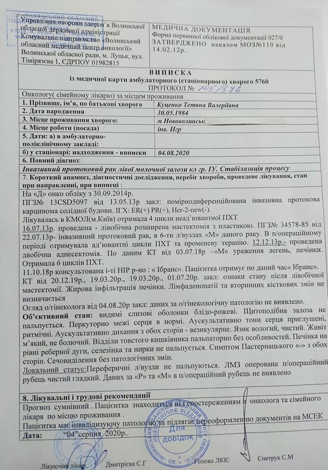 Жителька Нововолинська Тетяна Куценко живе вже вісім років з раком молочної залози 4 стадії. Жінка потребує дороговартістних ліків, які має приймати пожиттєво. Препапарат, який стримує розвиток хвороби – таргент «Ібранс».