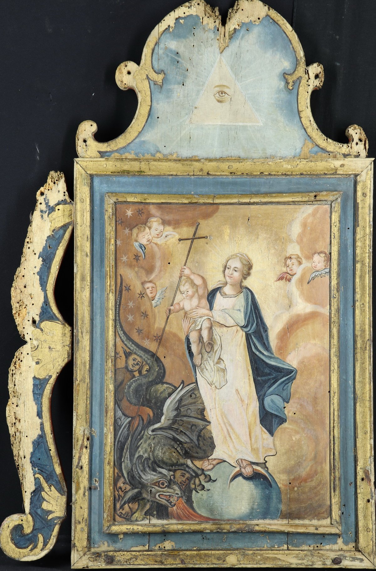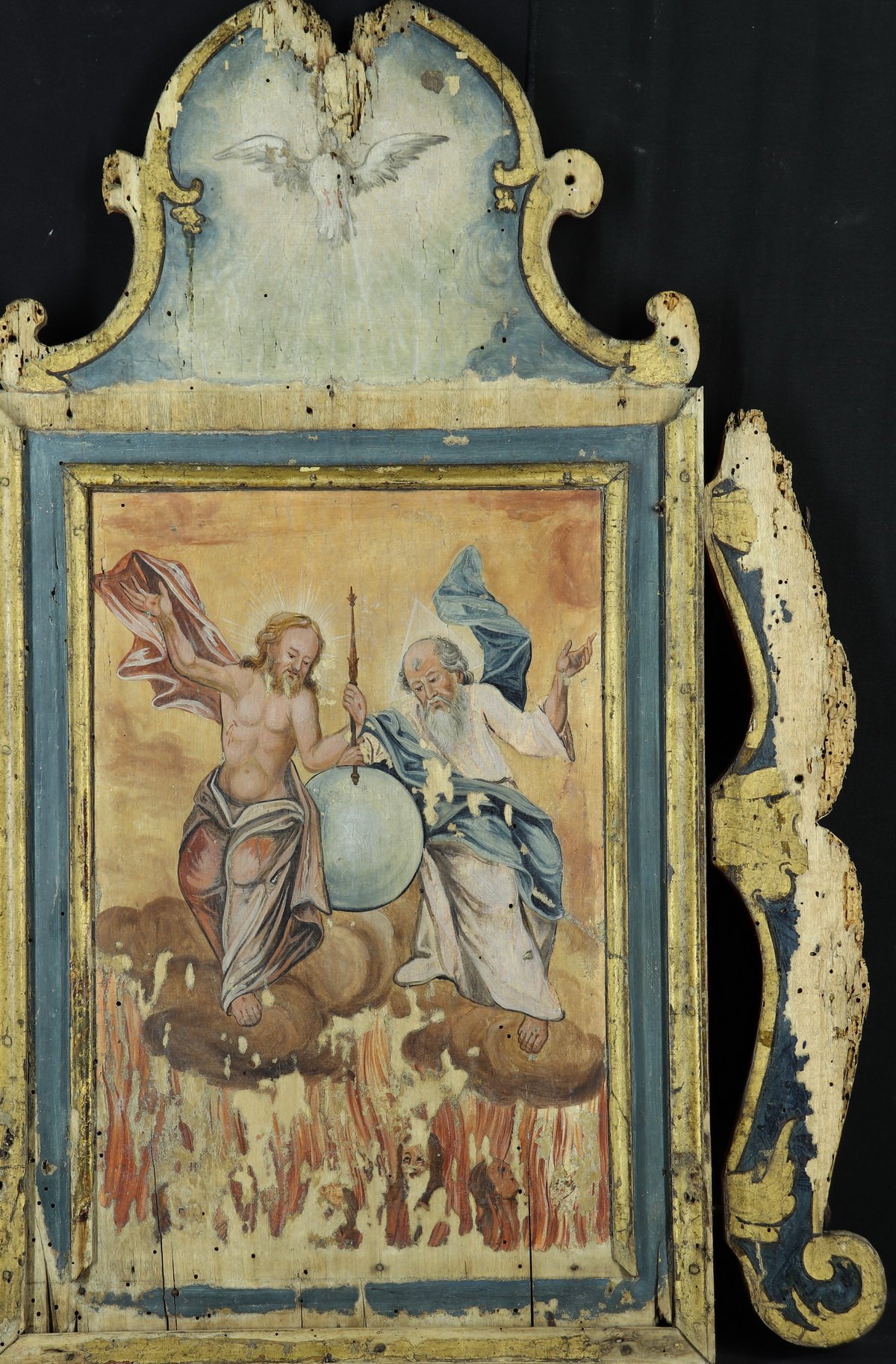 «З одного боку ікони змальований образ Новозавітної Трійці, символічне втілення християнського догмату про єдність трьох іпостасей Бога в особі Бога Батька, Бога Сина – Ісуса Христа і Духа Святого у вигляді білого голуба. Зображення займає верхню частину ікони і символізує божественний світ і звершення вищого небесного суду. Батько і Син тримають скіпетр, який стоїть на земній кулі і споглядають вниз, на землю, де у вогні спопеляються грішники. Зображення геєни вогненної є одним із елементів іконографії Страшного суду, який був обов’язковим у кожному храмі, як наочне нагадування про ведення праведного життя», – йдеться у повідомленні музейників.Інша частина феретрону збереглася краще. На ній авто зобразив «Непорочне зачаття Пресвятої Богородиці».Попри втрату деяких елементів ікони, відреставрований фетертон – цінний експонат для Музею волинської ікони.