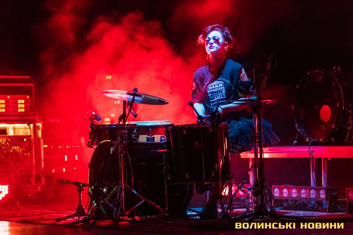 Усе це – про виступ у Луцьку столичного жіночого гурту Dakh Daughters, який складається з акторок театру «Дах» Влада Троїцького.Повен зал глядачів, які бурхливо реагували на кожен трек і танцювали. Гра світла і темряви. Графічні оздоби сцени. Драйвова, а часом тужлива музика з поезією або ж речитативом – від народних мотивів до оригінальних аранжувань, різними мовами. Це теж про виступ Dakh Daughters.Уявіть один із яскравих номерів, який називається «Слава Ісусу Христу»: актриса сидить на барабані і в образі старої жінки говіркою читає монолог про своє важке життя. А далі – потужний драйв (який не витримували навіть струни) та реп. Ось така еклектика і є характерною рисою гурту, його фішкою, яка приваблює, захоплює й не відпускає. Світло і тінь, смуток і радість, голосна, тиха музика і просто тиша, ритм і аритмія, норма і легке безумство…На завершення виступу зі сцени пролунали слова, нині важливі для нас усіх. Особливо контрастними вони видалися на тлі сценічних образів дівчат. Однак усі, хто знайомий із творчістю Dakh Daughters, добре знає їхню патріотичну позицію.