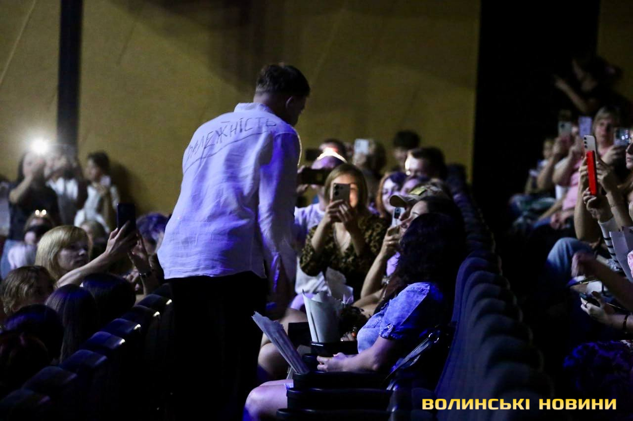 «Наступна пісня теж дуже трепетна – про одну з найдорожчих людей у житті. Що цікаво, як тільки я виставляю шматочок цієї пісні у соцмережі, він стовідсотково потрапляє в рекомендації. І я розумію, що ця тема багатьом близька. Брат або сестра. Якщо у вас немає рідних, але є друзі, які так само близькі, як брат або сестра, цінуйте це. Тому що найцінніше, що люди можуть нам віддати, – це свій час, бо його точно ніколи не повернеш», – сказав перед виконанням треку співак.Щоб розрядити обстановку, згодом артист вийшов у зал, де разом із глядачами виконав пісню «Будз». Опісля він повернувся на сцену та заспівав вже відомий хіт «Манила» та спільну пісню з PAUCHEK – «Ти». А під час «Кіно вино», яку співак записав спільно з виконавцем NIKITIN, фан-зона підготувала для артиста сюрприз – підняла вгору малюнки з попкорном, вином і нумератором, створивши справжній флешмоб. Це розчулило та водночас стало приємним сюрпризом для виконавця.«Я не вірю, що ви всі, такі прекрасні, прийшли на концерт, та ще й підписалися на авантюру від моєї фан-зони. Це щось неймовірне, відійду від теми, але я виріс в селі, доглядав господарство, і коли ще не було інтернету, дивився по телевізору різні талант-шоу й думав: як круто, коли людей хтось чує, коли їхня творчість стає чиєюсь залежністю, а чи вийде колись в мене так? І сьогодні я не вірю, що стою тут, ви прийшли до мене і розчулили мою душу. Якщо ви сьогодні отримаєте емоції, я буду на сьомому небі від щастя. Бо завжди кажу: вік – то тільки цифра в паспорті, а стан душі – це треба вміти зберігати», – звернувся зі сцени артист.