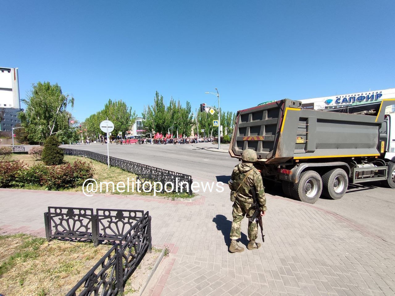 «Губернатор від окупантів Євген Балицький звіз все своє сімейство з Криму. Сьогодні на шоу під назвою «Безсмертний полк» в місто приїхали й жителі Луганська. Автобусами звозили в Мелітополь жителів Мирного та інших прилеглих сіл. Загалом прибули 3 тисячі осіб. Вони дружно вишикувалися в черзі в парку за солдатською кашею. На мітинг також зігнали російських солдатів і ряджених козаків. Колона йшла в оточенні озброєних військових з автоматами. Більше того, військові стежили за тим, щоб чужі не проникли в колону. Все в дусі НКВС», – зазначає видання.