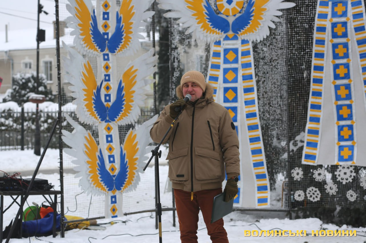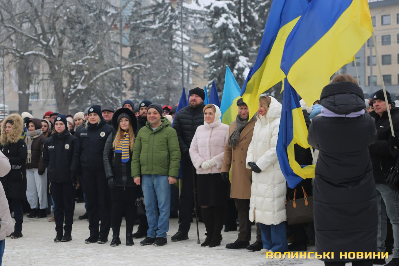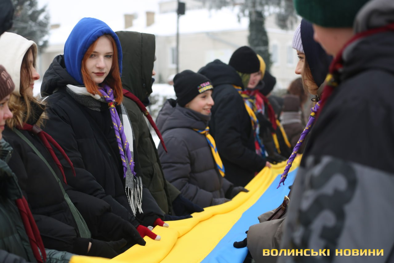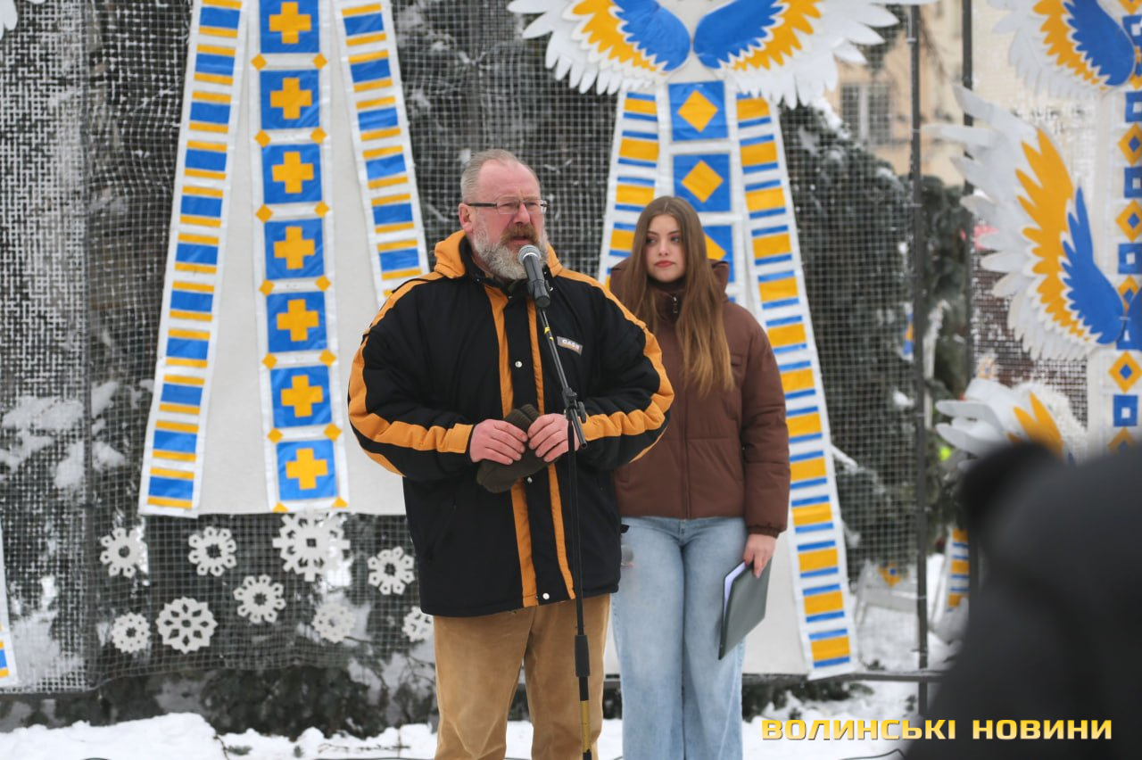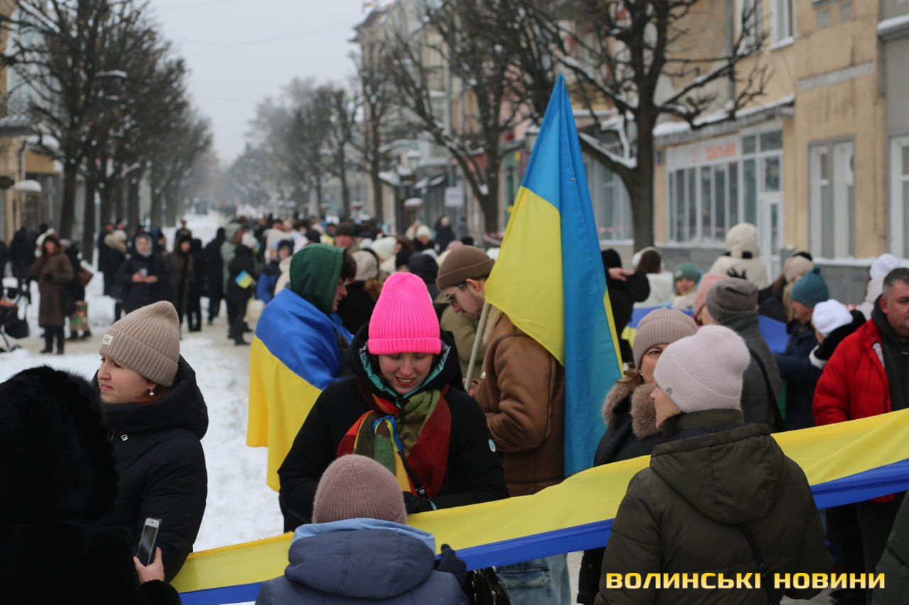 «Дякую всім, хто бере участь у заході. Ми відзначаємо день, коли споконвічні українські землі ЗУНР і УНР об’єдналися в єдину державу. Ми починаємо захід на священному місці, де є портрети наших Героїв з Волині. Але більшість із них загинули на Донбасі, Сумщині, Запоріжжі, Херсонщині – на споконвічних українських землях. Вони окропили єднання кров’ю. Із цього майдану в 1990 році громадськість Луцька і Волині їхала на «Ланцюг єднання». І стояли вони десь між Рівненщиною та Житомирщиною, стояли на різних відрізках, бо відчували єднання», – пригадав Сергій Годлевський.Акція засвідчила патріотизм і сильний дух українського народу. Незважаючи на морозну погоду, лучани міцно тримали державний стяг. Така ініціатива стала нагадуванням, що Україну не зламати й не розділити.