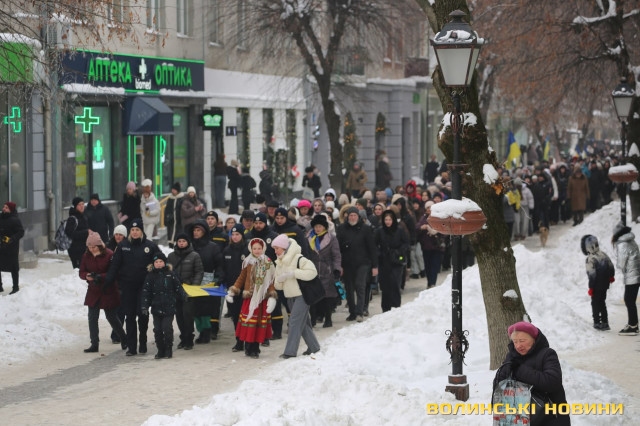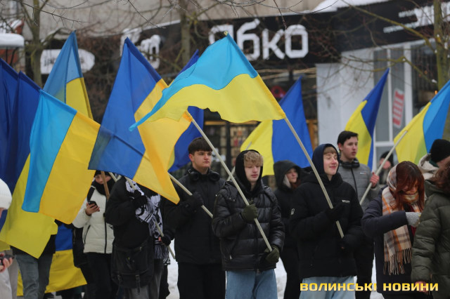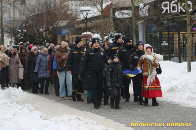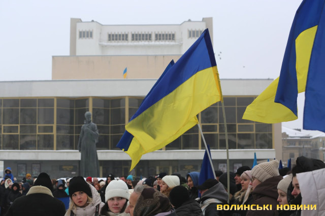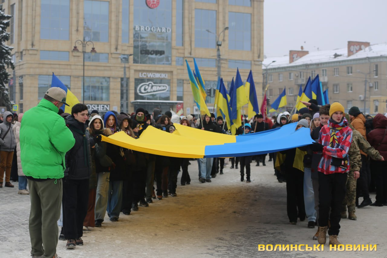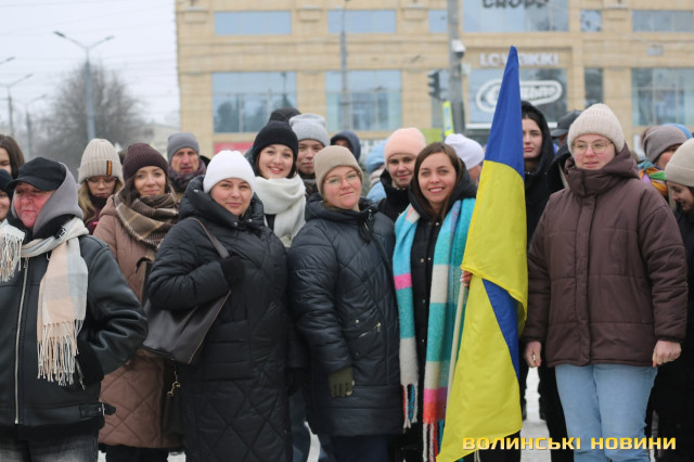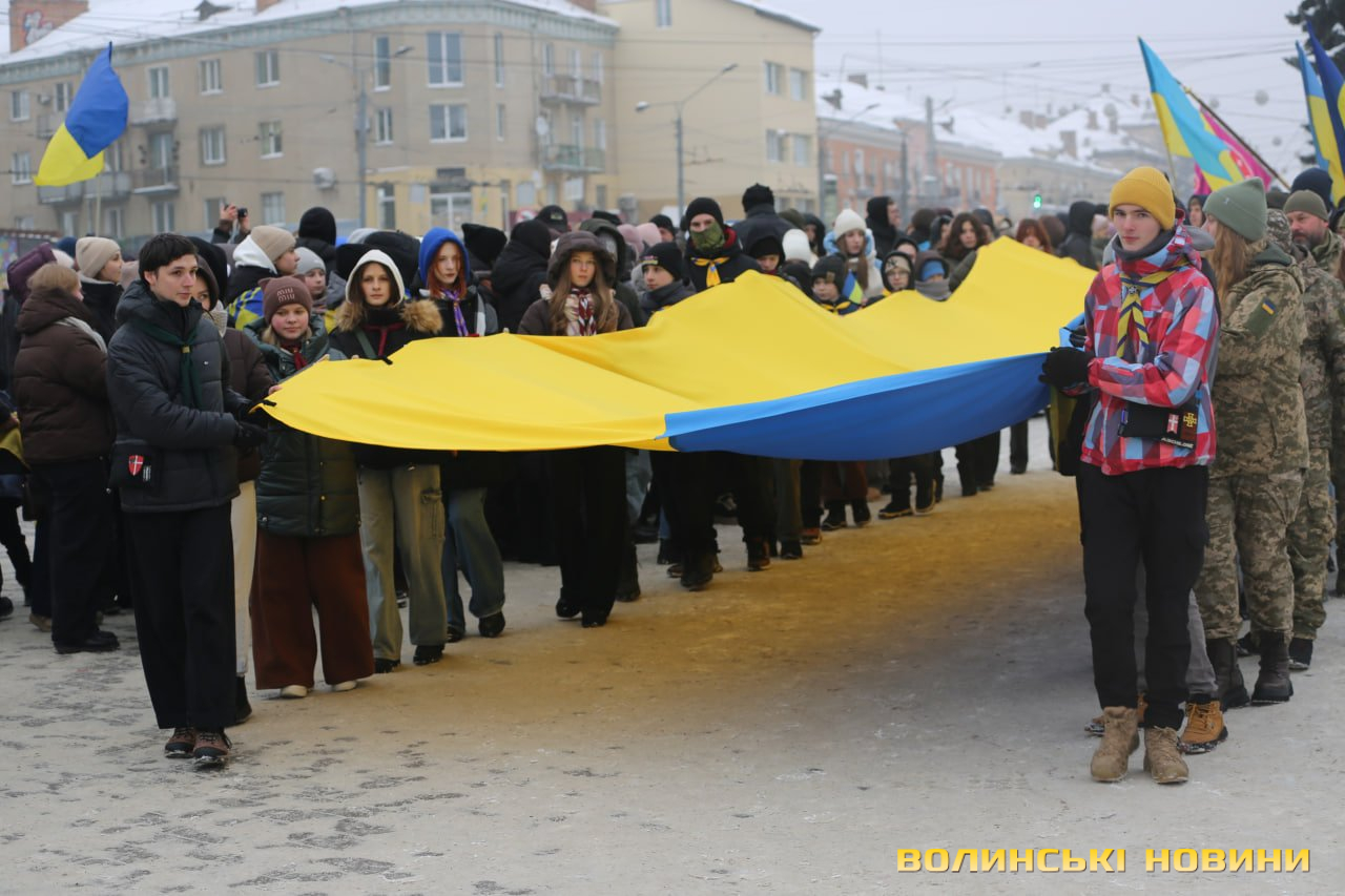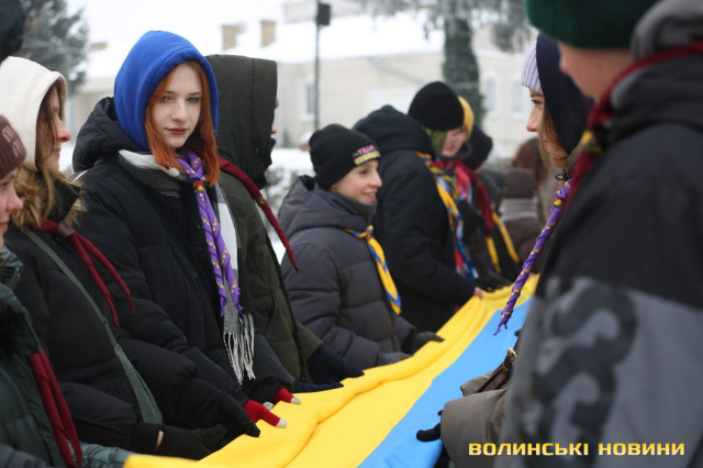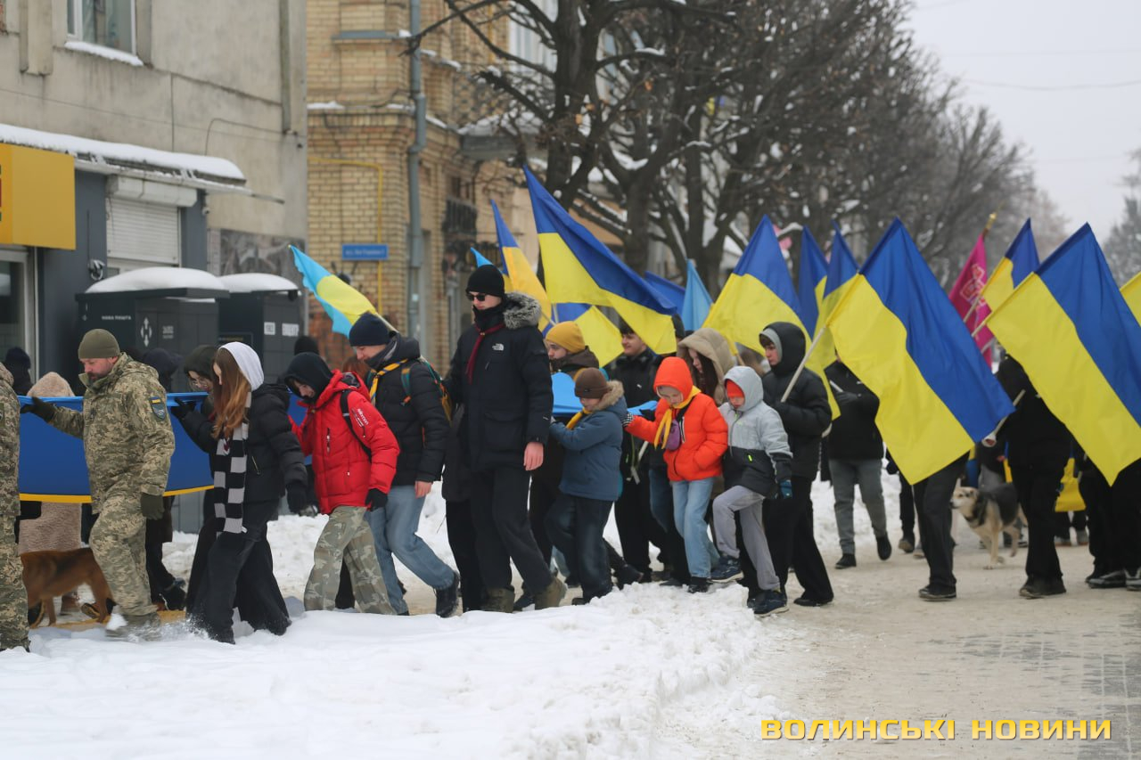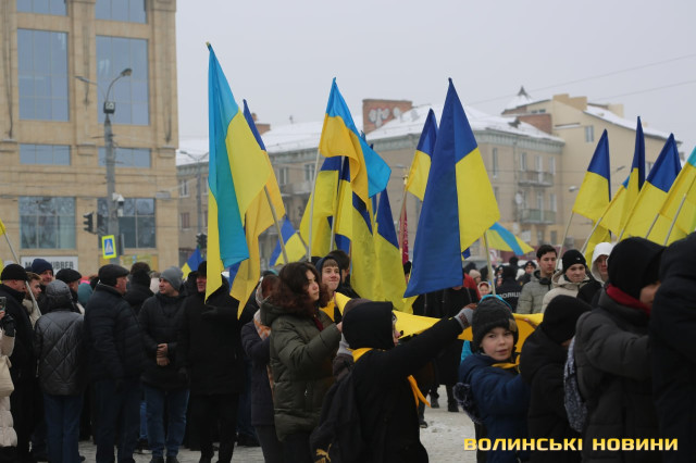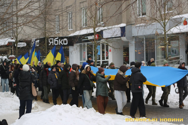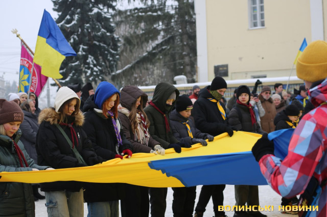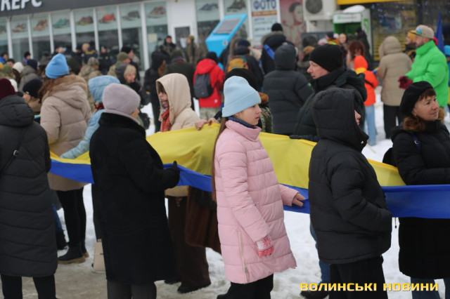 У центрі Луцька організували акцію «Ланцюг єднання», приурочену до Дня Соборності України. Учасники пройшли пішою ходою і розгорнули 200-метровий жовто-блакитний прапор.