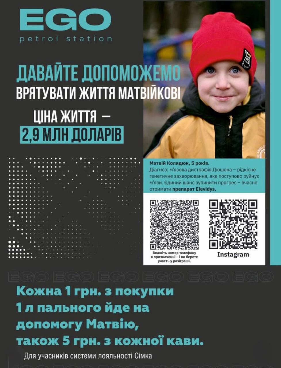 З 31 січня на всіх автозаправних станціях EGO стартувала масштабна благодійна акція на підтримку маленького Матвія Колядюка, який бореться з важким генетичним захворюванням і потребує дороговартісного лікування.