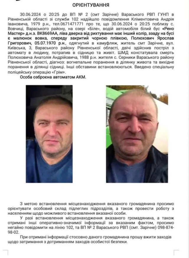 У мережі публікують орієнтування на Полюховича Ярослава Григоровича, який попередньо і застрелив чоловіка. Зловмисник був одягнутий у камуфляж, при собі має автомат.