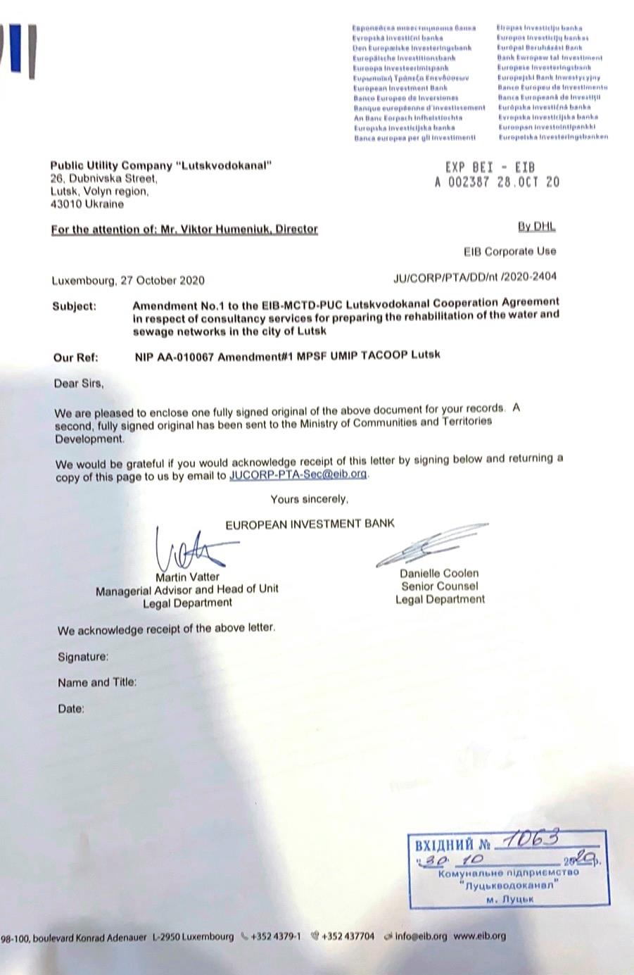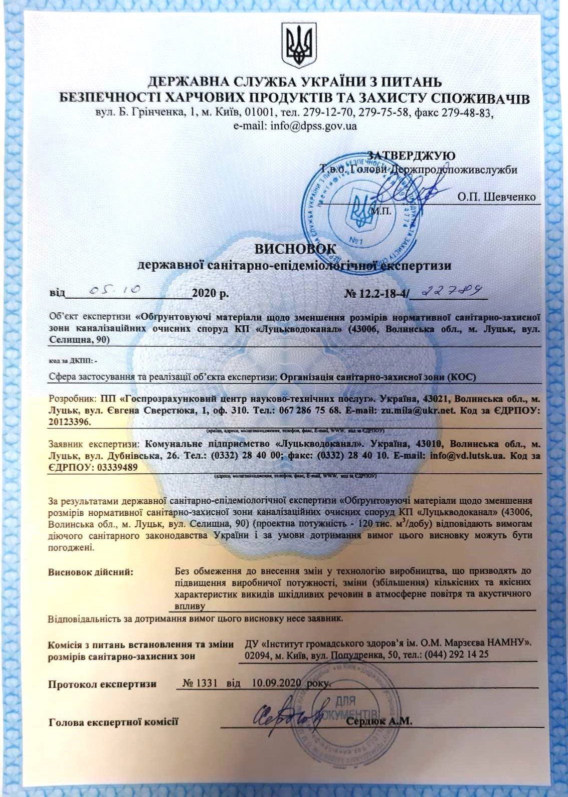 5. КП «Луцькводоканал» отримало позитивний висновок державної санітарно-епідеміологічної експертизи, яка підтвердила, що діяльність очисних споруд підприємства здійснюється у відповідності з встановленими нормами і правилами експлуатації. Виготовлена вся необхідна документація та дозволи на роботу всіх об’єктів підприємства.6. Найпотужніший за всю історію роботи підприємства проєкт реконструкції очисних споруд і мереж у співпраці з Європейським інвестиційним банком наближається до визначення генпідрядника і початку практичних робіт. Подано остаточні документи для підписання договору з Європейським інвестиційним банком, міжнародні експерти готують тендерну документацію для оголошення процедури залучення генерального підрядника на виконання робіт з реконструкції очисних споруд. Після обрання генпідрядника із дотриманням всіх законодавчих процедур розпочнеться фаза реалізації запланованих заходів.