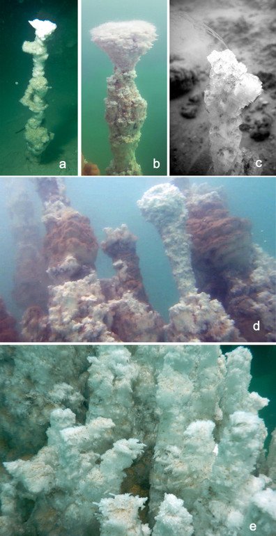 Під час досліджень дайвери знайшли на дні моря незвичайні структури – соляні труби заввишки до семи метрів і з діаметром у два-три метри, з яких витікає білувата рідина.Аналіз показав, що рідина походить із прісних підземних джерел. Вона проходить через солоні відкладення під Мертвим морем, розчиняє сіль і утворює розчин, який кристалізується.