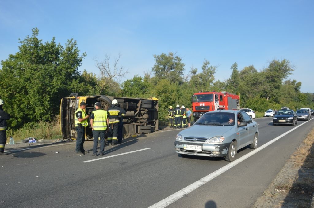 Як зазначається, водій фури в'їхав ззаду в "Еталон", який прямував за маршрутом "Зоря-Дніпро". Від потужного удару маршрутка перекинулася, до того ж на проїжджу частину впали бетонні стовпи.