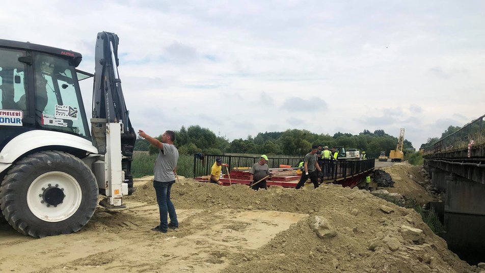 «Ми облаштували міст на берегові опори. Зараз робимо перильне огородження, облаштовуємо бордюри, зварюємо, скручуємо перила і будемо влаштовувати перехідні плити з бетонними опорами», – розповів інженер компанії-підрядника Володимир Подільник.
