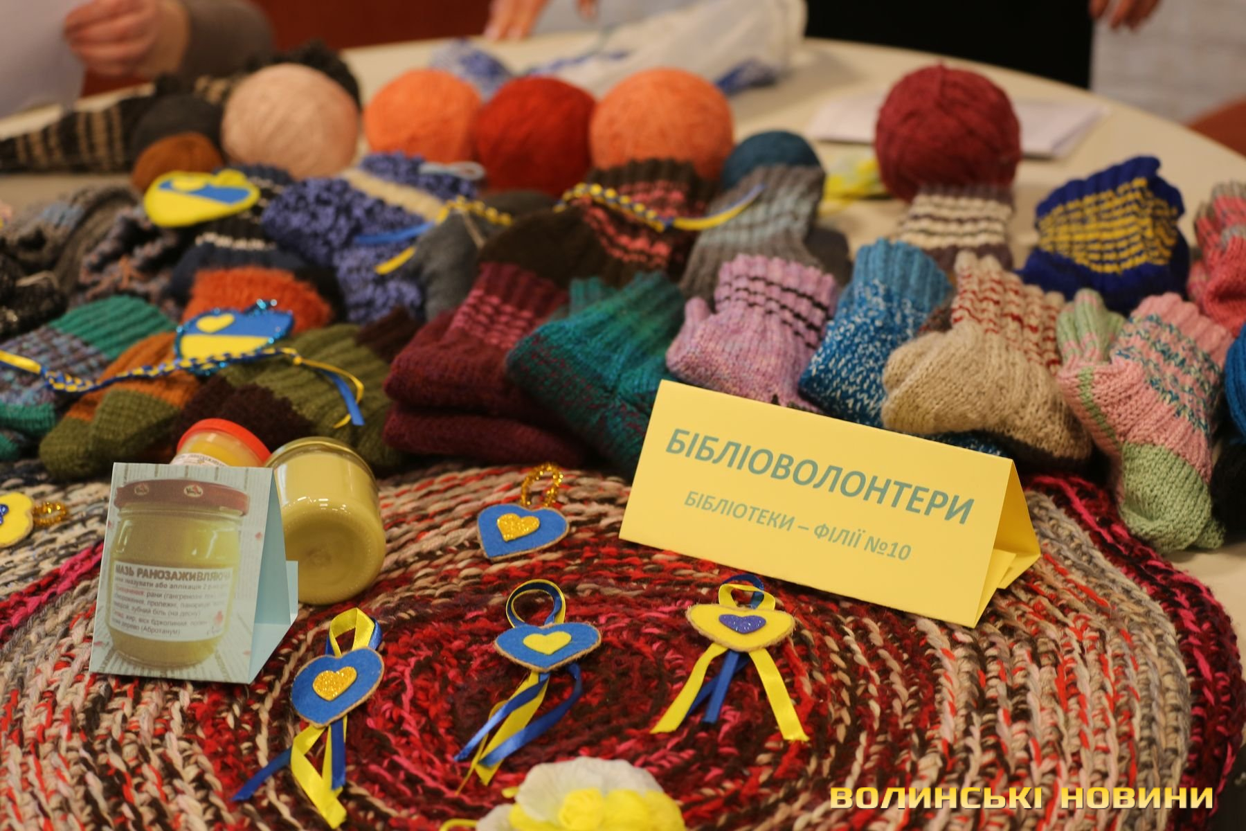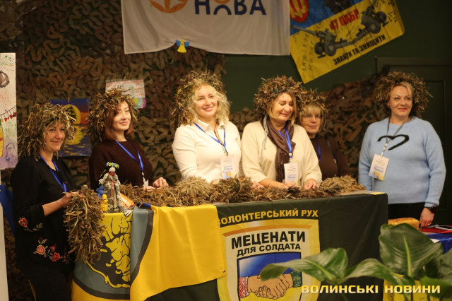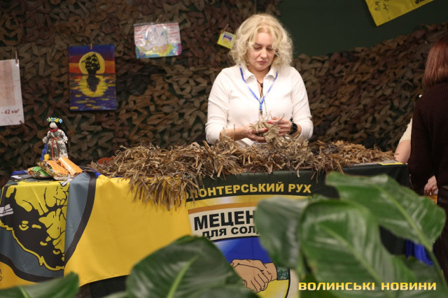 У холі «Батьківщини» працювала алея волонтерських ініціатив. Десять громадських та благодійних організацій показали результати своєї діяльності. Тут вироби з тканини, солодощі, сувеніри, медобладнання й інші речі.Об’єднання «Бібліоволонтери» на форумі вперше. Їхня організація сформувалася із відвідувачів бібліотеки № 10, які на початку повномасштабки стали до плетіння сіток. На показ жінки виставили в’язані шкарпетки, килимки й цілющі мазі.«На третій день повномасштабного вторгнення ми відчинили бібліотеку і працювали без вихідних. Основне заняття – плетіння маскувальних сіток. У рік плетемо десь до 700 штук. «Бібліоволонтерами» стали свідомі люди із числа читачів бібліотеки. У нас є жінка, що варить цілющі мазі, інші займаються в’язанням. А від форуму очікуємо нового досвіду й нових знайомств», – розповіла організаторка об’єднання Алла Фень.Читати ще: Ярмарок ветеранського бізнесу в Луцьку супроводжували виступи артистів. Фоторепортаж