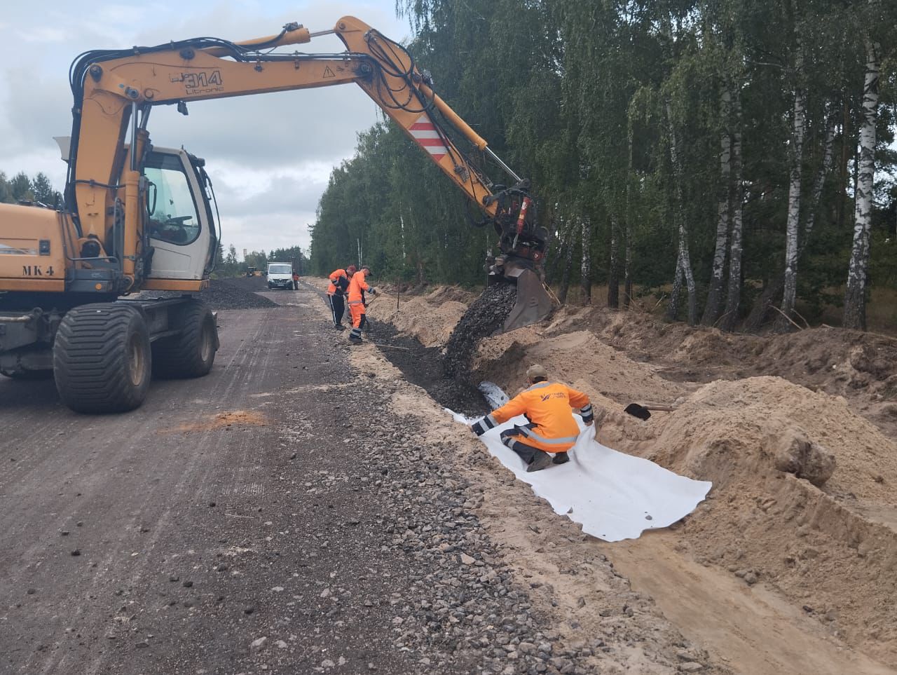 На іншому – тривають роботи з розширення існуючого дорожнього одягу. Спершу у підготовлених рівчаках дорожники влаштовують дренажний шар з піску, на ньому укладають геотекстильний матеріал, а зверху – шар щебенево-піщаної суміші.