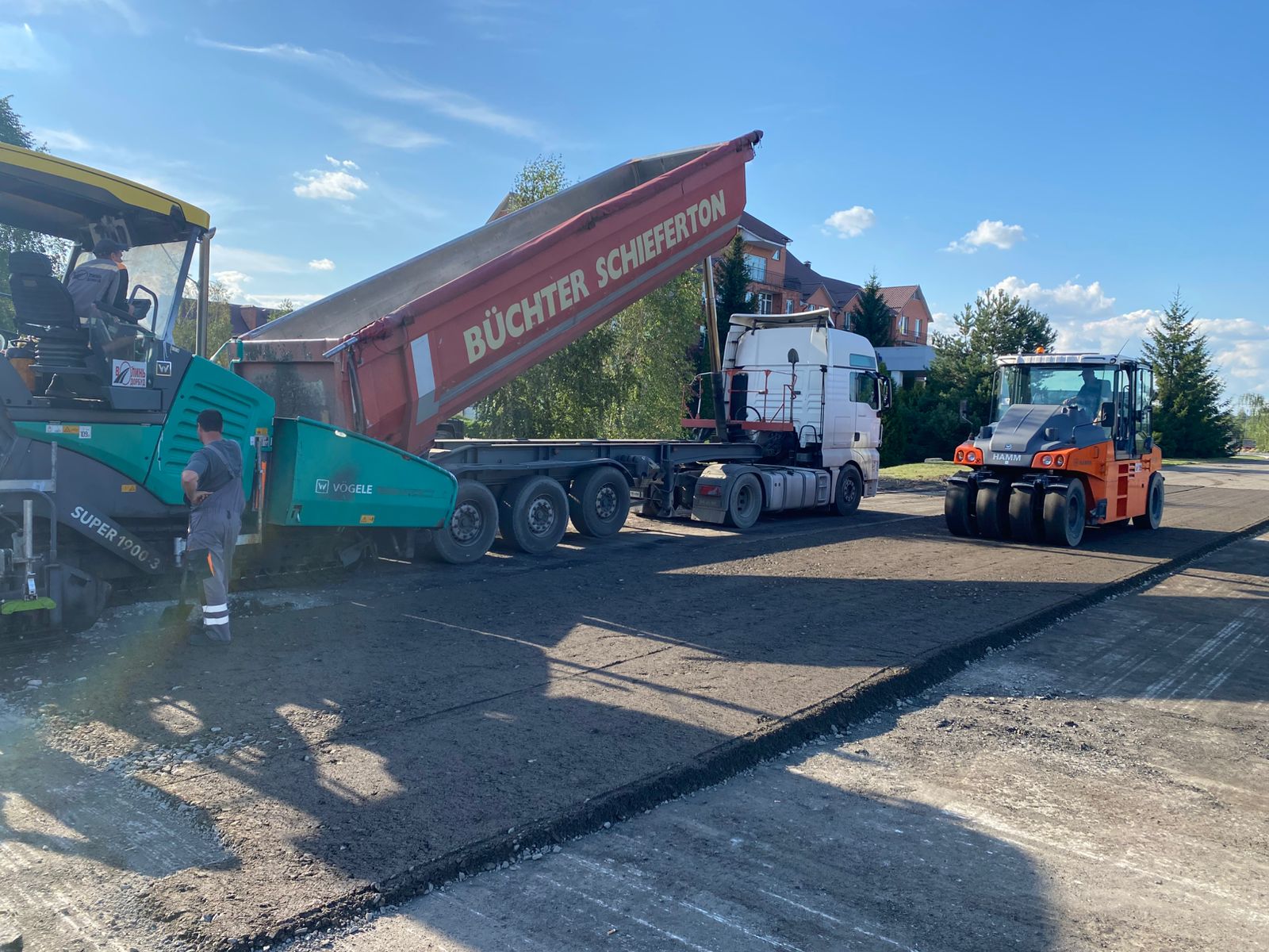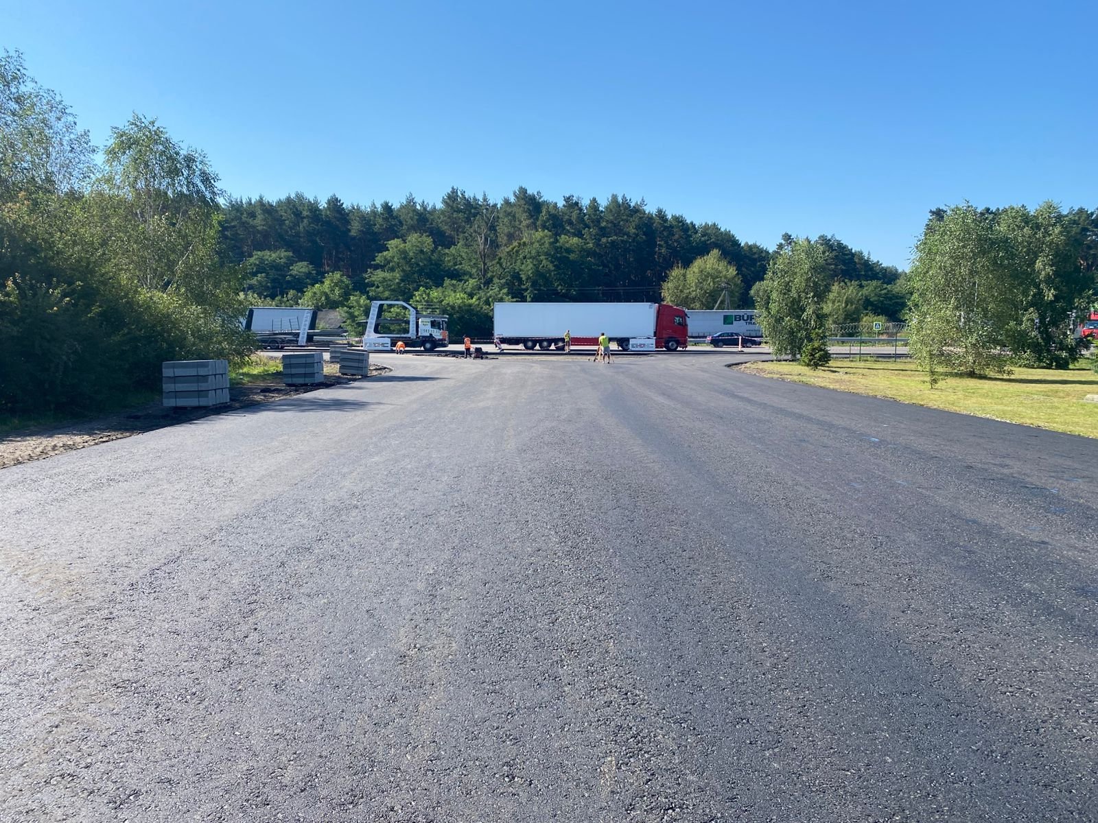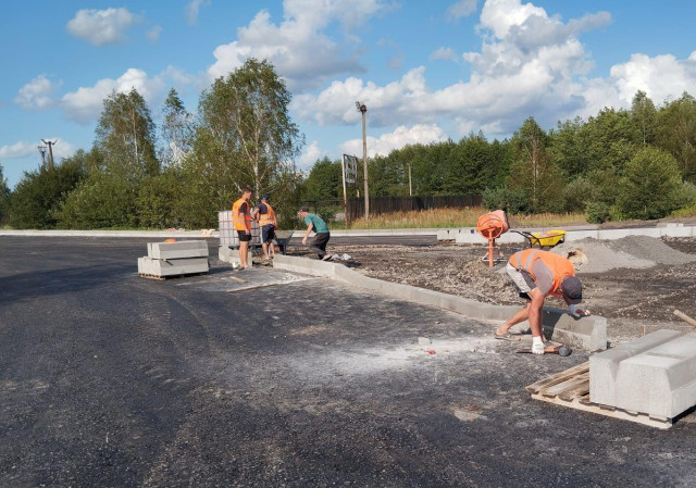 На одному з під’їздів до пункту пропуску уже укладено перший з трьох передбачених проєктом шарів асфальтобетонного покриття та розпочато роботи з влаштування тротуару.