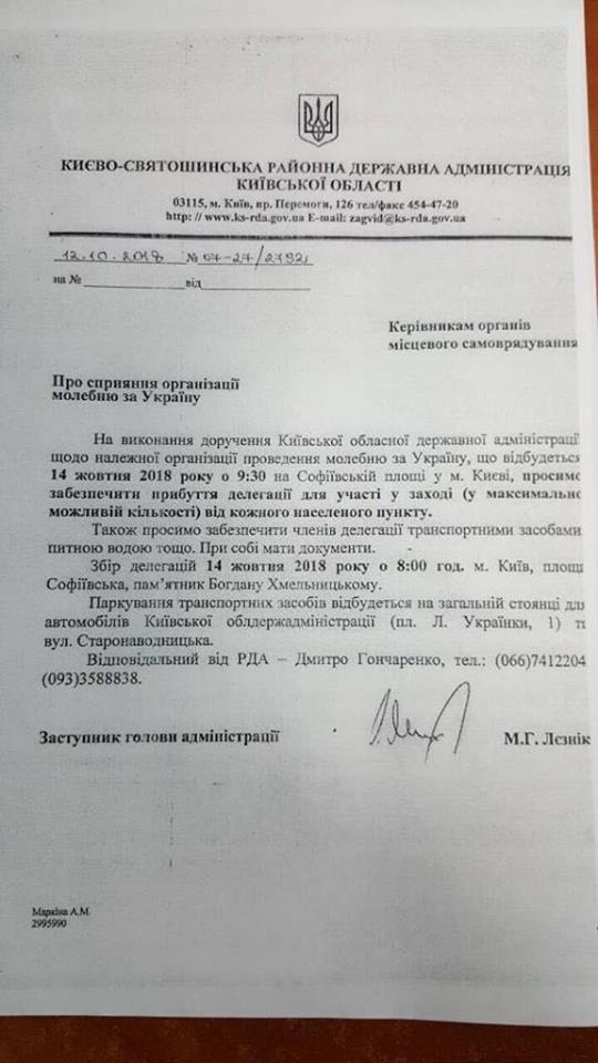 У розпорядженні "Страны" опинився документ, згідно з яким Києво-Святошинська районна адміністрація столиці наказала керівникам органів місцевого самоврядування надати людей для участі в заході "в максимально можливій кількості" від кожного населеного пункту. Збір намічений на 8 ранку 14 жовтня на Софійській площі біля пам'ятника Богдану Хмельницькому.