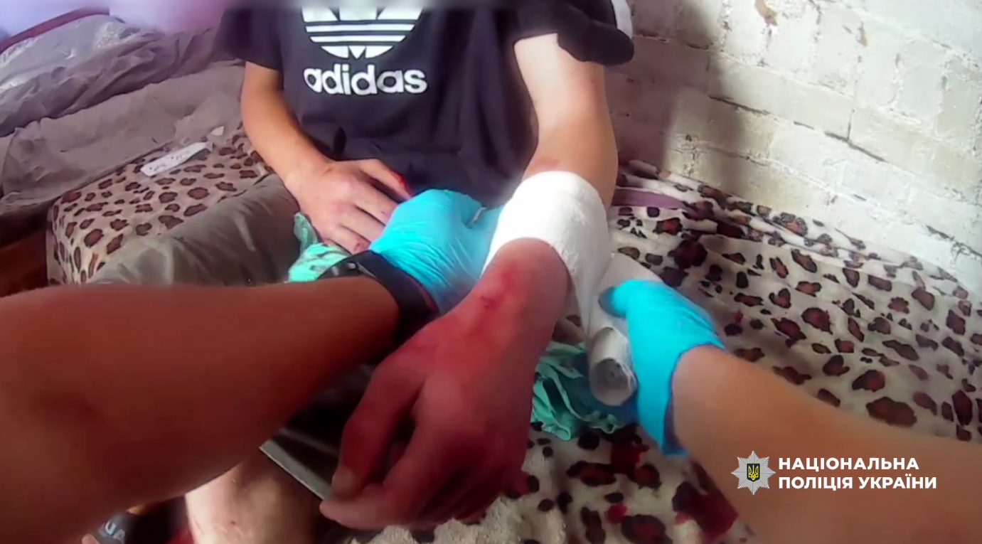 На місце оперативно прибув наряд місцевої поліції. Хлопець повідомив, що порізав себе ножицями. Правоохоронці Олександр Кіпень та Євген Трохимук одразу зорієнтувалися та надали хлопцю якісну домедичну допомогу, заспокоюючи і його, і матір.