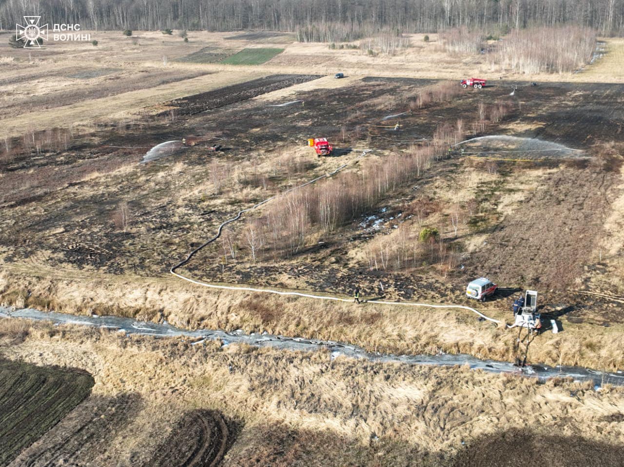 Сьогодні о 07:00 до Служби порятунку 101 надійшло повідомлення про загоряння торфу поблизу села Гута Боровенська в урочищі Пусте болото Камінь-Каширського району.