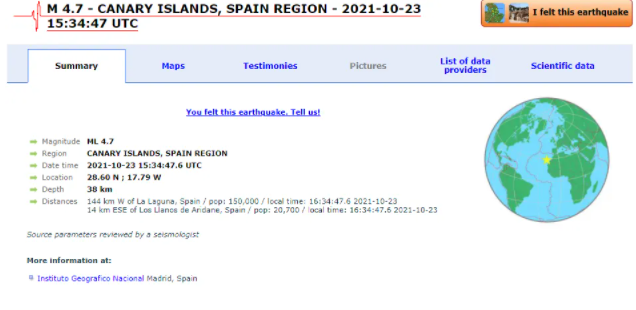 Науковий комітет Спеціального плану захисту від вулканічних ризиків Канарських островів (Pevolca) підтвердив цю обставину. Його представник Мігель Анхель Моркуенде зазначив, що осередок землетрусу – на північному заході, за 144 км на захід від Ла Лагуни – на глибині 38 км.Найближчий до епіцентру населений пункт (14 км) – Лос Ланос де Аріжане. Відомостей про жертв і руйнування поки не надходило.