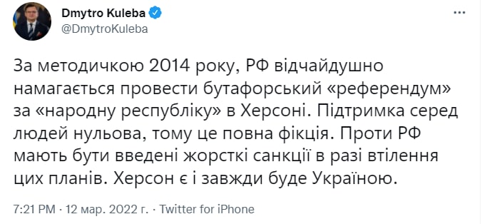Як зазначив міністр закордонних справ України Дмитро Кулеба, це повна фікція й окупанти не знайдуть жодної підтримки серед українців.