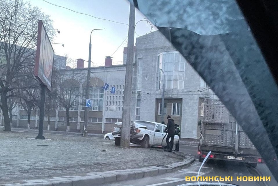 На кільці в Луцьку – ДТП: Волга в’їхала в стовп. Фото
