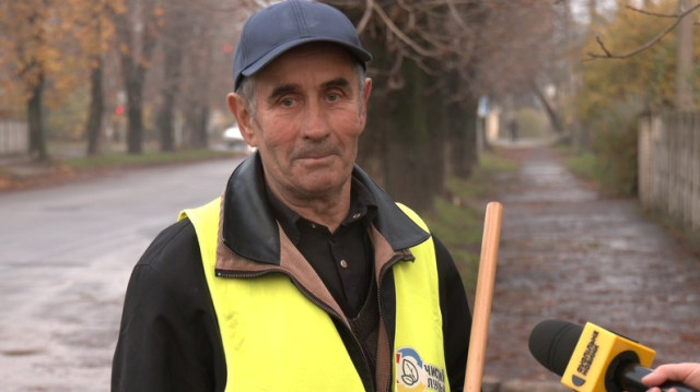 Ярослав Ралець 40 років працює двірником. Каже: листопад: найбільш «гарячий» місяць. Чоловік прибирає вулицю Потебні. З неї вже вивезли орієнтовно 10 тонн опалого листя.