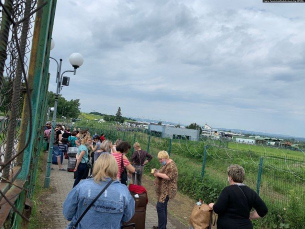 Така ситуація склалася перед пунктом пропуску «Медика». У натовпі говорити про дотримання соціальної дистанції в півтора метра не доводиться. Крім того, деякі знаходяться там навіть без масок, повідомляє Радіо Свобода.