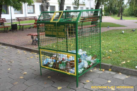 Вкинути пляшку до спеціалізованої урни можна біля скверика неподалік Луцького міськрайонного суду.