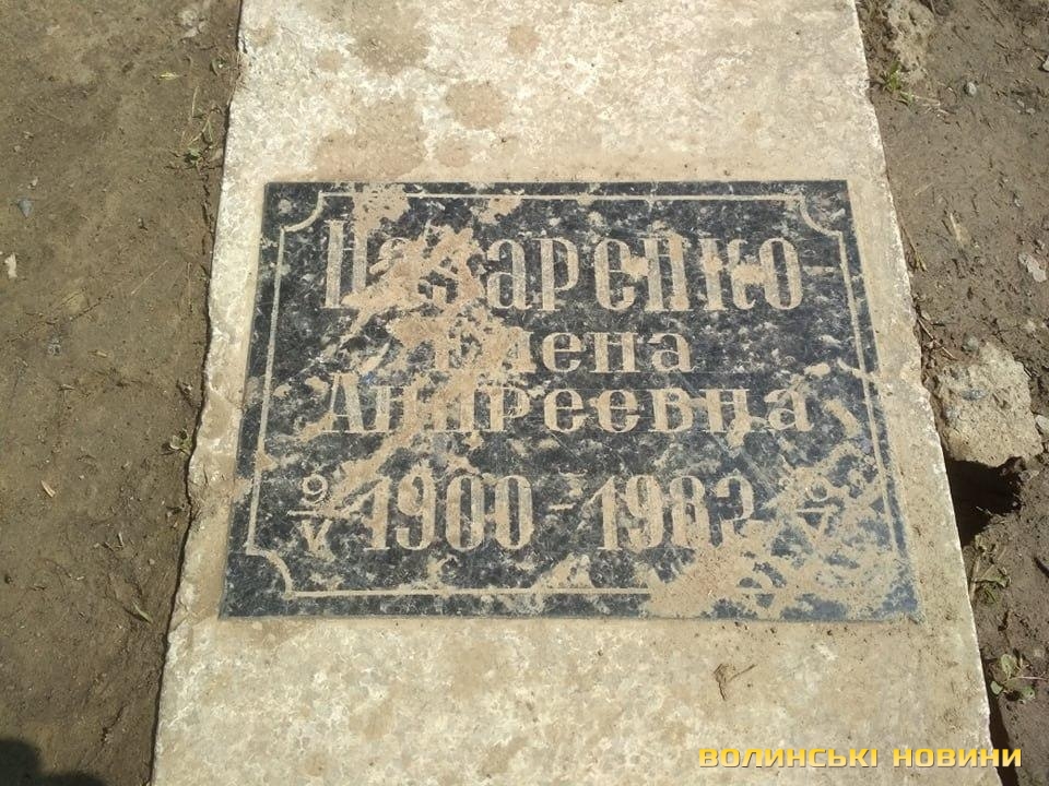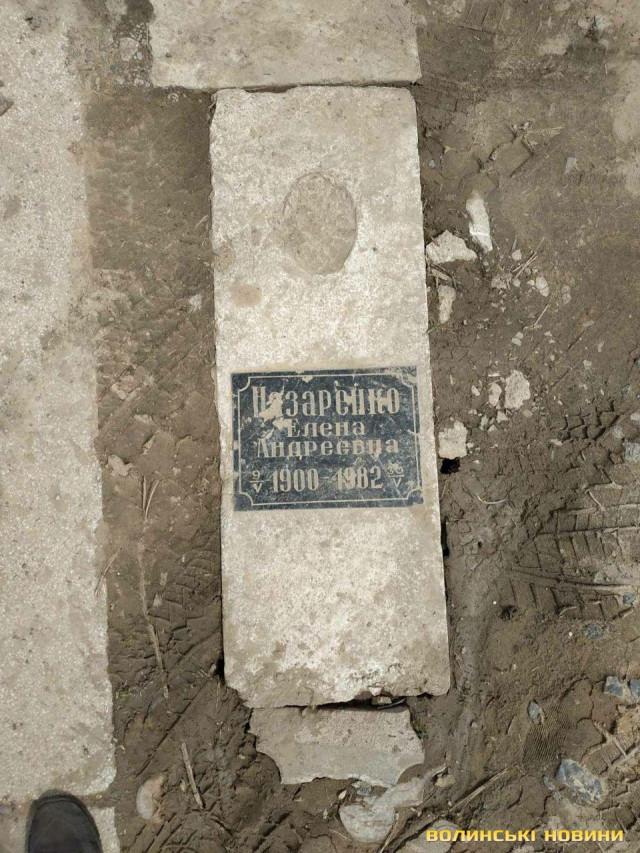 На фотографіях видно, що надгробна плита лежить збоку біля бетонної дороги на перехресті 161 сектору. На ній написано: «Назаренко Елена Андреевна. 1900-1982».