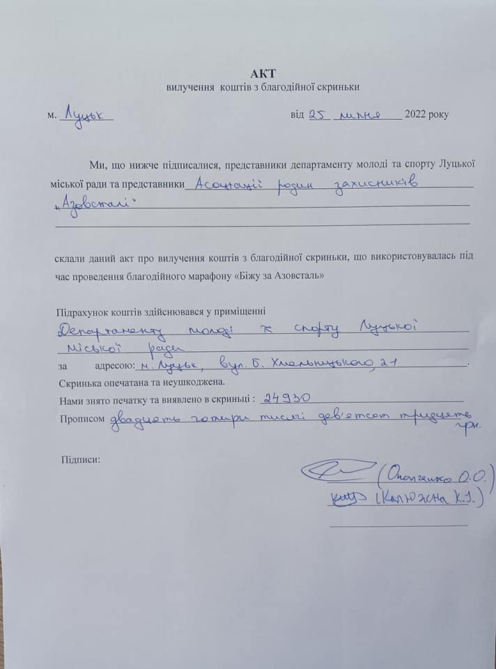 Також було здійснено вилучення коштів зі скриньки у присутності обох сторін. Завдяки учасникам заходу зібрано 24 930 грн. Кошти будуть передані Катериною в Асоціацію для подальших необхідних дій.