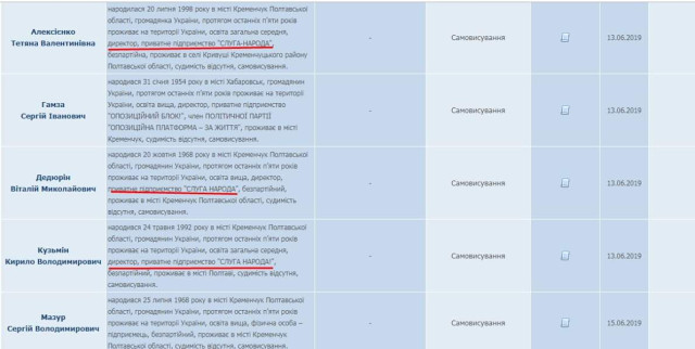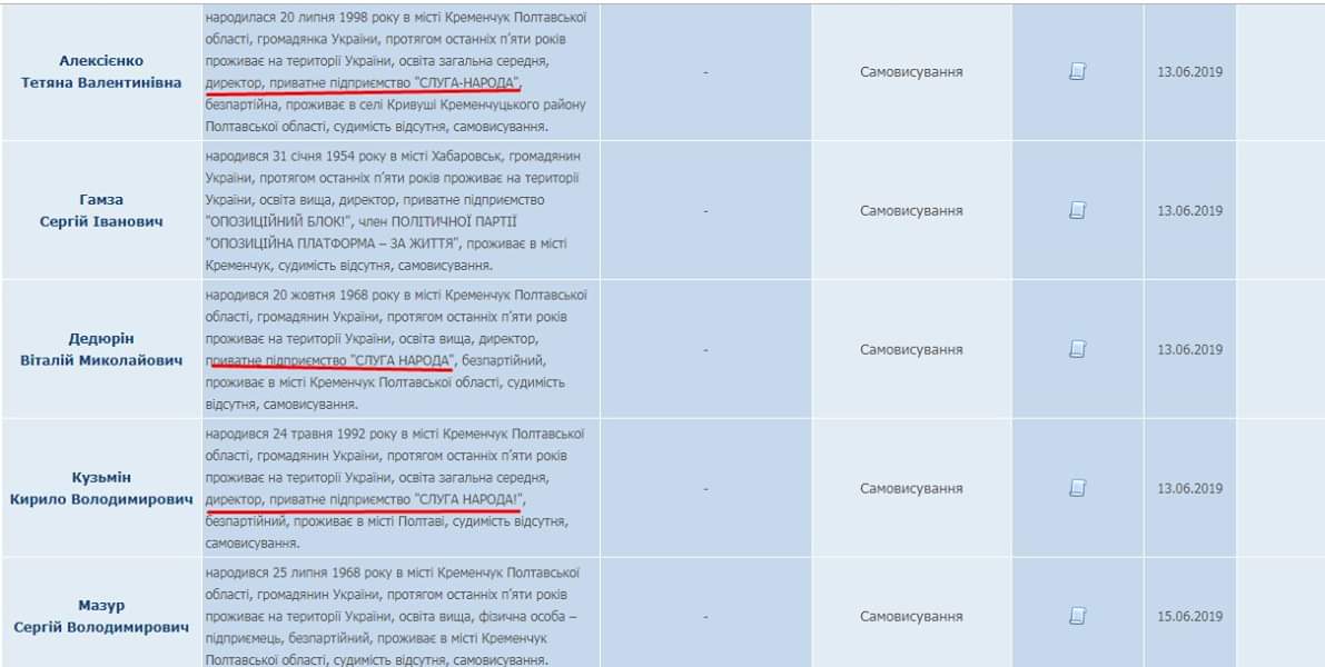 Всі потенційні депутати в короткій біографічній довідці не вказують місця роботи, тільки приналежність до громадської організації.Ще один округ – 146 з центром в місті Кременчук Полтавської області має трьох кандидатів «Слуги народу». Точніше, від трьох різних підприємств, які називаються «Слуга народу». Всі вони були зареєстровані тиждень тому в один день, але за різними юридичними адресами зі статутним капіталом не більше 1 тисячі гривень.Також «двійники» є на 95, 94, 38 територіальних округах.