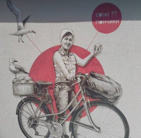 На Волині з’явився мурал із зображенням жінки на велосипеді, яка продає традиційні пончики. Його автор – художник Юрій Чайка, відомий серією муралів «Люди міста» в Луцьку.