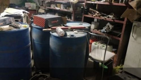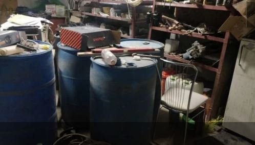 Під час слідчих дій правоохоронці знайшли 4 бочки об’ємом по 250 літрів, наповнені алкоголем. Загальний об’єм алкоголю становив 1 тисячу літрів. Також у будинку було ще сотня пустих пластикових бочок.