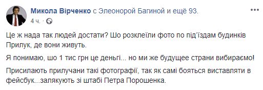 «Це ж треба так людей дістати? Що розклеїли фото по під’їздах будинків Прилук, де вони живуть. Я розумію, що 1 тис. грн це гроші ... але ми ж майбутнє країни вибираємо!» – написав Вірченко.