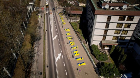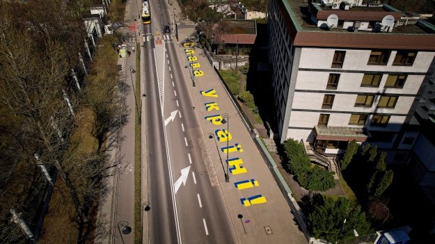 На пішохідній доріжці біля посольства РФ у Варшаві з’явився велетенський напис «Слава Україні»