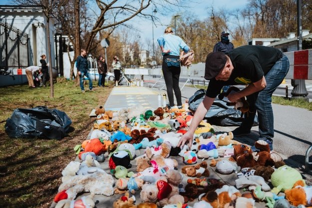 Одна з інсталяцій – численні м’які іграшки, які можуть символізувати постраждалих дітей.
