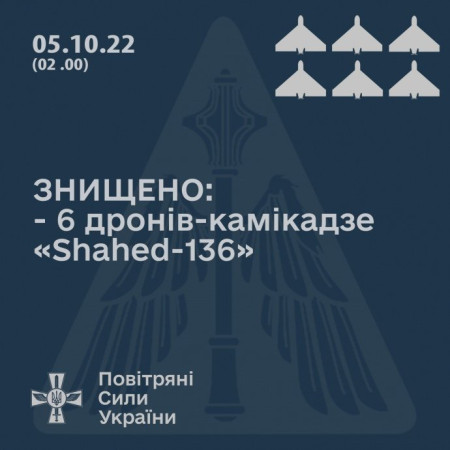 Уночі 5 жовтня російські окупаційні війська атакували Україну безпілотниками-камікадзе «Shahed-136». Шість дронів-камікадзе знищено зенітними ракетними підрозділами Повітряних Сил на півдні країни.