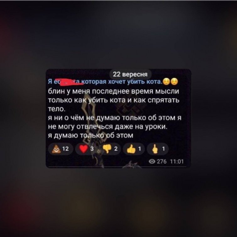 Також дівчинка описувала у соцмережах свій намір і бажання вбити кота.Зоозахисники вимагають провести перевірку та притягнути до відповідальності батьків або опікунів за невиконання їхніх обов’язків щодо виховання дітей, якщо на це будуть підстави.