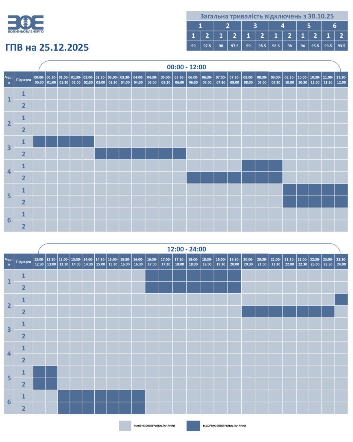 У четвер, 25 грудня, у Волинській області діятимуть графіки погодинного відключення електроенергії.