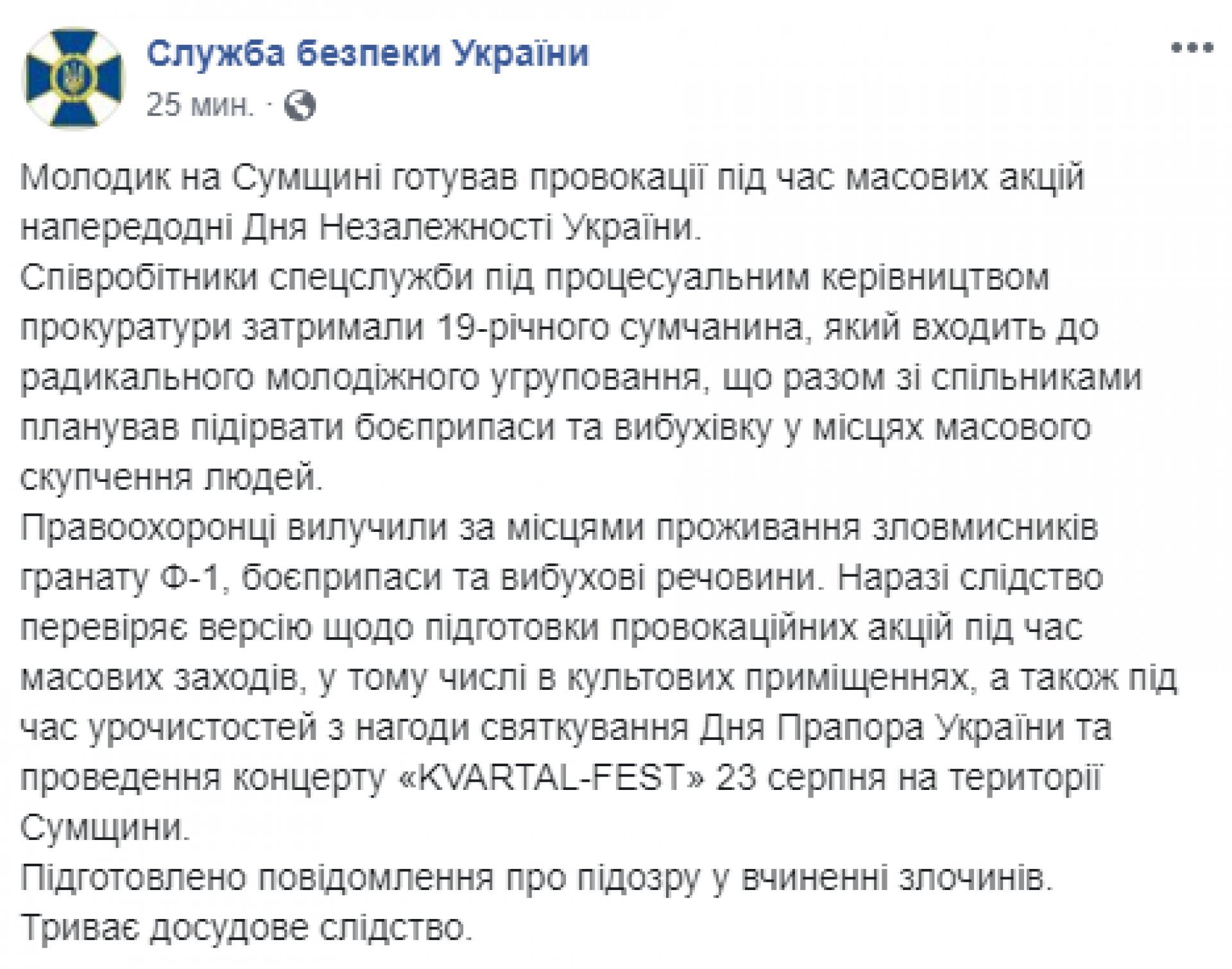 Слідство перевіряє версію щодо підготовки «провокаційних акцій» під час масових заходів, у тому числі в культових приміщеннях, а також під час урочистостей з нагоди святкування Дня Прапора України та проведення концерту Kvartal-Fest 23 серпня на території Сумщини.