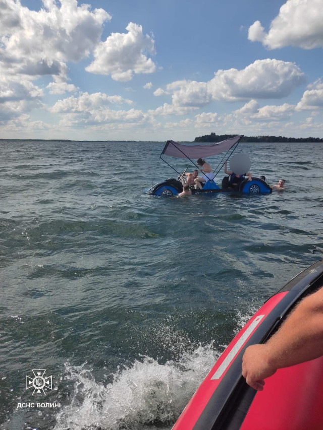 Нагадаємо, 6 липня на відстані 1,5 км від центрального пляжу озера Світязь почав тонути катамаран, на якому перебувало семеро осіб. На місце події було направлено чергове водолазне рятувальне відділення сел. Шацьк, які на катері дісталися до відпочивальників та доставили всіх до берега.