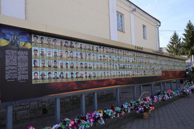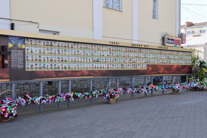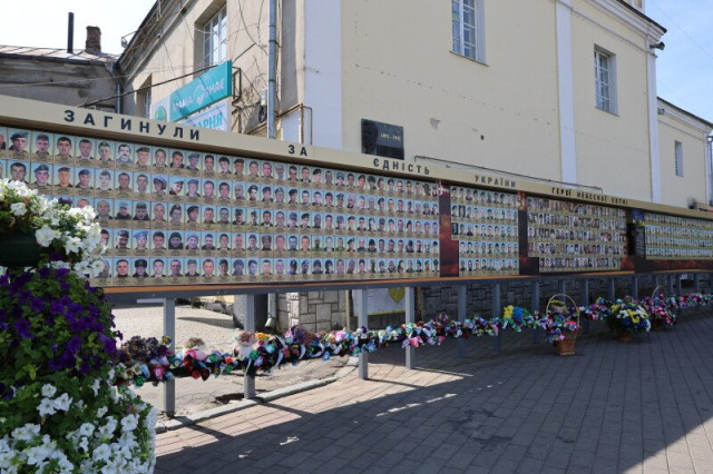 За 10 років, на жаль, його кілька разів розширювали. Довжина фотостенду тепер складає понад 22 метри. Загалом тут розміщено більш як 560 світлин наших воїнів та цивільних громадян, які віддали життя за Україну. Фотостенд складається з трьох частин: «Небесна сотня», «Загинули за єдність України» та «Герої нескореної України».